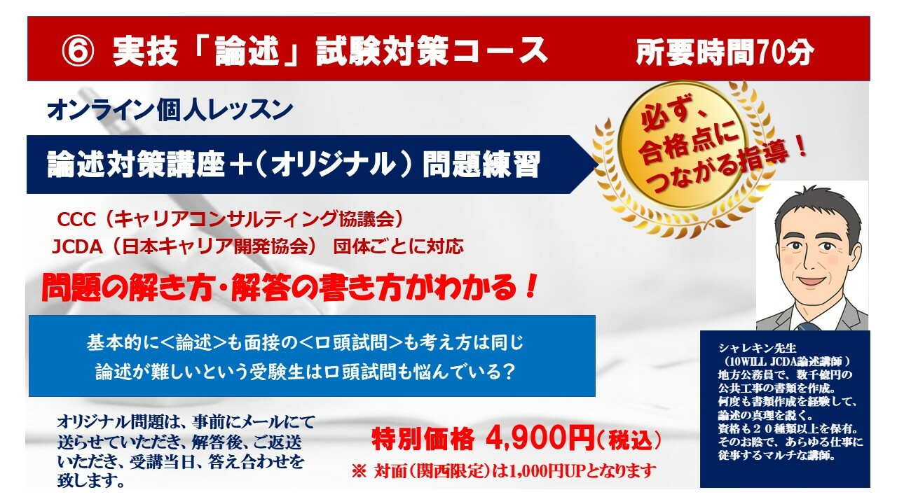 「キャリアコンサルタント実技試験対策講座」6 実技「論述」試験対策コースオンライン約70分¥4900オンライン(zoom)