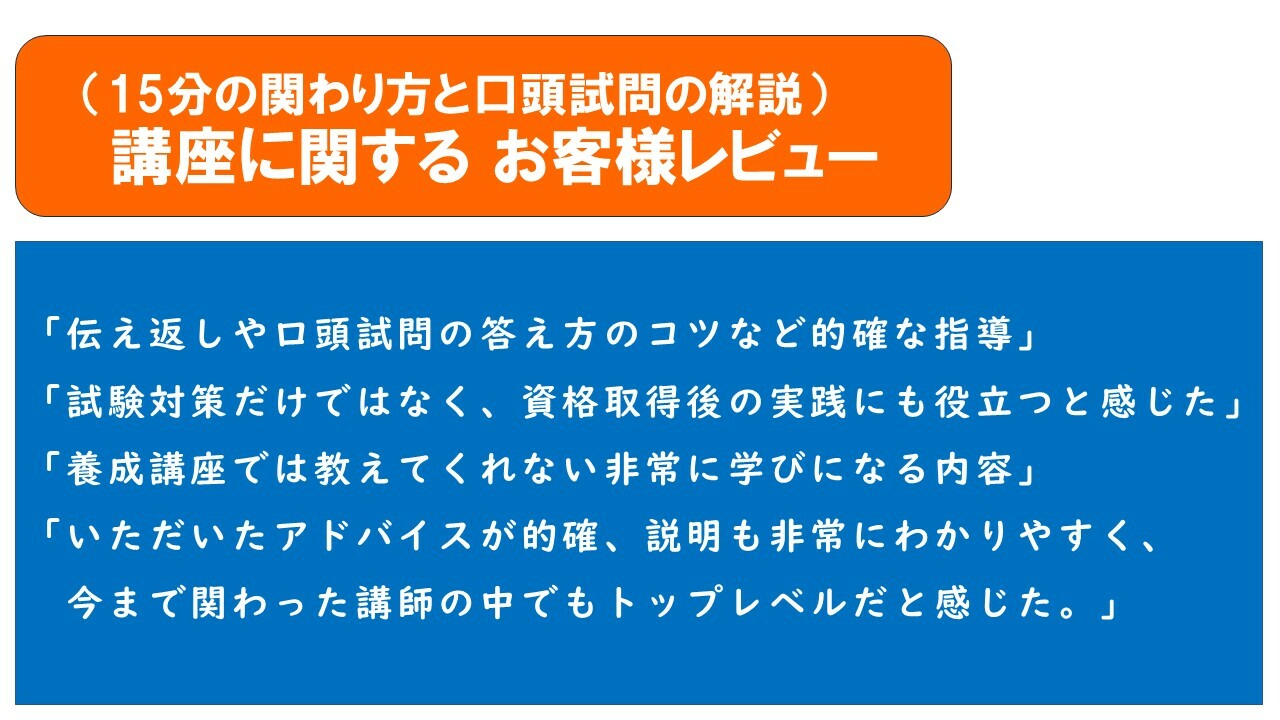 その後、口頭試問の答え方を見ていただくと、試験官の「口頭試問の質問」と「実技面接の採点」がどういうところを見ているかが理解できます。