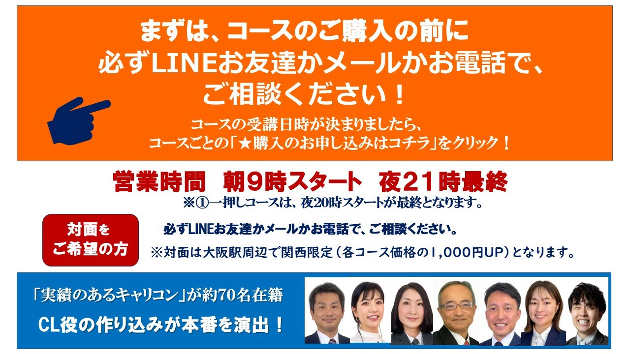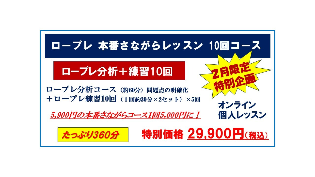 ご連絡くださいませ。★講座お申し込みはコチラ【2月限定特別企画】ロープレ 本番さながら 10回コースy29900