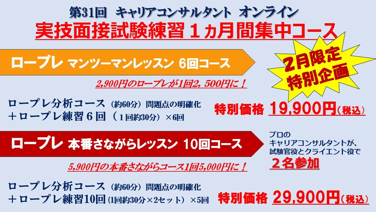 【2月限定特別企画】ロープレ 本番さながら 10回コースオンライン約360分¥29900実技面接試験の実践で緊張対策!